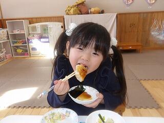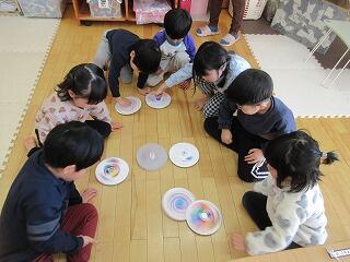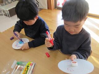 今年初めてのなかよし活動は、正月遊び‼まずは、コマ作りをしました。丸い型にペンで色を塗ったり、絵を描いたりして完成★作ると早速回し、「わ~‼すごい‼めっちゃ回る」と回ることに大喜び‼「せーのーでー」と声を掛けて、誰が長く回るのか勝負をする子もいましたよ。コマ遊びの他にも、羽根付きやカルタ、福笑いでも遊び、正月遊びを時間いっぱい楽しみました。お正月遊びの後は、皆も楽しみにしていた餅焼き‼焼きたてのお餅にチーズとのりをトッピングし、砂糖醤油をつけて美味しくいただきました。お正月にも家から食べた子も多く、皆お餅が大好きのようです。