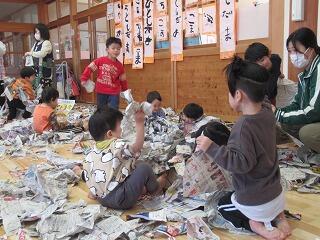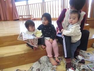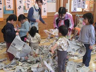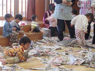 今日はホールで新聞遊びをしました。たくさんの新聞紙を広げてびりびり破っていくと、丸めて投げてみたり、新聞紙を広げて持って走ってみたりして楽しんでいると、ほかのクラスのお友だちも遊びに来てくれました。たくさん新聞紙があるので、一緒に遊ぼうと誘うと、小さい子を見てくれるお兄さん達。一緒に破ったり、破った新聞紙を集めたり、お布団のように新聞紙を掛けたりして思い切り楽しみました。最後はホールいっぱいの新聞紙をみんなできれいに集めました。