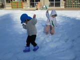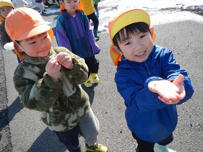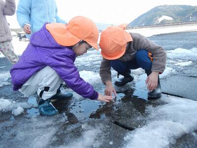 「先生、来るとき、氷でつるつるしとった。」「氷で転びそうになった。」と、朝から氷の話題で盛り上がっていたので、探検隊に変身し、氷を探しに出かけました。川沿いの道で氷を発見し、大喜び。「あったー‼氷だー。」「手に持っとったら、つめたいなー。」と言いながら、しゃがんでこすったり、のぞいたりしなから、次々に氷を見つけていました。「雪が凍っとるけ、雪氷だ。」と雪と氷が混ざったものを見つけたり、「氷を空にむけたらピカピカしとるー。」など、日の光を浴びて輝く氷のきれいさにうっとりしたりしていました。
