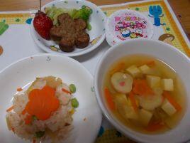 今日は3月生まれのお友達2名のお誕生会でした。ステージの上で少しドキドキしている様子でしたが、お名前や大きくなったらなりたいもの・好きな食べ物を上手にお話してくれました。クラスのお友達からプレゼントをもらうとニッコリ笑顔も見せてくれましたよ。そして、今月のおたのしみは『キッチンオーケストラ』♪いつもはお料理に使うお鍋やフライパン、お玉にしゃもじが楽器に変身。キューピー3分クッキングの曲合わせて色々な音が聞こえましたよ。最後はみんな大好きアンパンマンの歌で一緒に歌ったり手拍子をしたりして楽しいおたのしみとなりました。