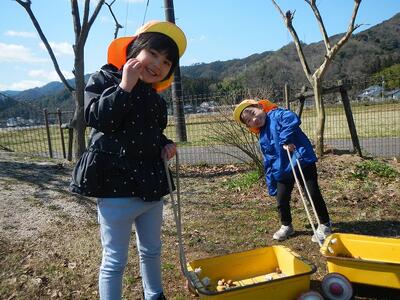 お日様が出ていい天気。園庭で遊びました。秋の木の実を再発見し、集めたり、焚火ごっこをしようと小枝を集めたりと色々集めて楽しんでいました。ぽかぽかの外に笑顔がいっぱいでした。