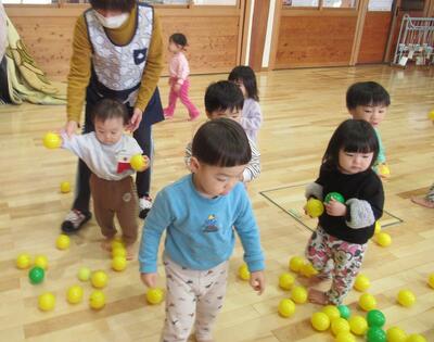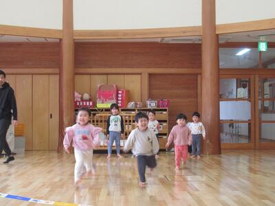 今日はお別れ遠足の日。あいにくの天気と寒さでしたが、雨が止む時間もあったので少しだけお外に出る事ができましたよ!3クラスで仲良く歩いたあとはホールで運動会ごっこを楽しみました♪