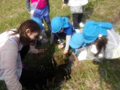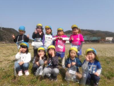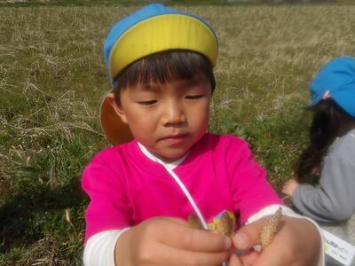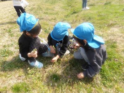 春らしい暖かいお天気になり、春みつけ散歩にでかけました。可愛いお花をたくさん咲いていて、「キレイだね」と早速お花摘みに夢中になっていましたよ。つくしやカエルも見つけ、春をたくさん感じたお散歩になりました。