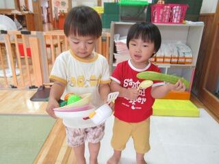 今日は運動会の練習後、お部屋でおままごとをして楽しみました。たくさんご馳走を作っては保育者に「はいどーぞ!」とくれました。もぐもぐと食べる真似をしてお皿を返すと、満面の笑みでお皿を受け取る子ども達。給食までにお腹いっぱいになりました(笑)運動会練習で同年代の子同士、手を繋いで歩く練習をしていますが、お部屋でも手を繋いでニコニコのみかん組さん、明日はいよいよ本番!みんな頑張って~‼