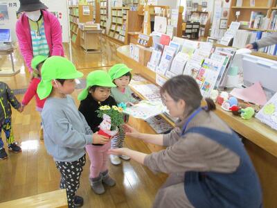 図書館に到着すると、昨日作った感謝状とお花をスタッフの方にプレゼントし、絵本も見させてもらいました♪