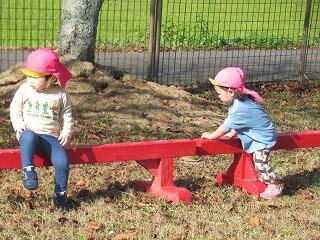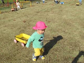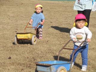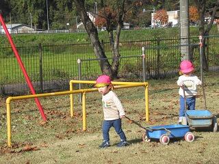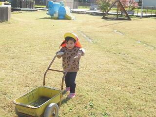 今日はとてもいいお天気だったので、園庭に出て散策を楽しみました。滑り台を滑ったり、猫車に葉っぱやボールを入れてお散歩を楽しみました。一人の子が猫車を持つと、みんなが同じように猫車を出して、みんなで並んで引っ張ってとことこ園庭並走してみたり、大きな葉っぱを見つけて楽しそうでした。