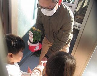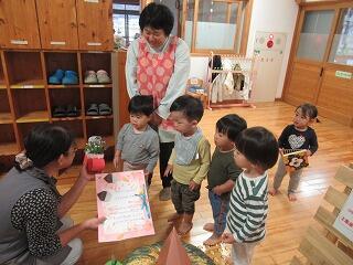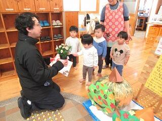 お野菜、牛乳、食材を届けてくれる業者さんに手作りで作った感謝状とお花をプレゼントしました。食べることが大好きなみかん組さん、大きな声で「ありがとう」とお礼の言葉を言って感謝状やお花を渡していました。