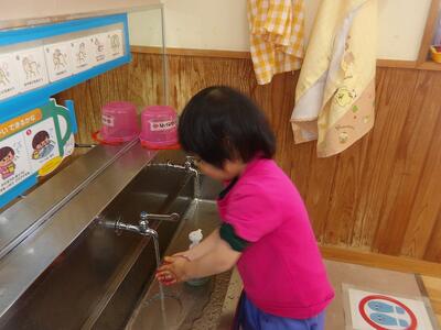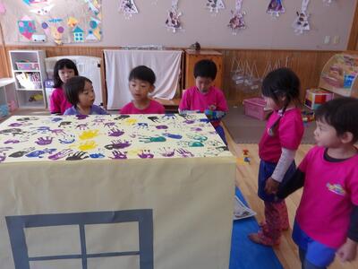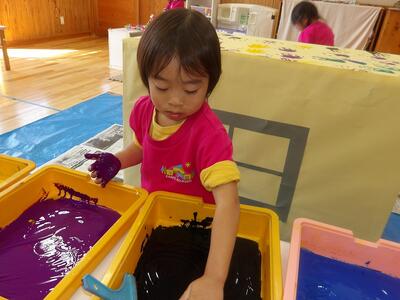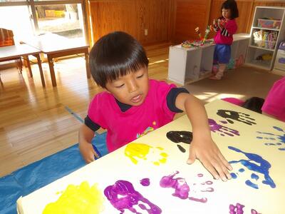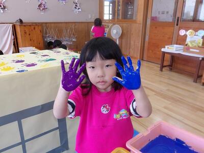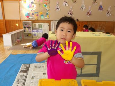 今日は手に絵の具をたっぷりつけて手型をペタペタペッタン!!手に絵の具が付く感触が気持ちよかったり、くすぐったかったりで大騒ぎのちゅうりっぷさんでした。手を洗いながら色が混ざると他の色に変化することに気づいて、教えてくれる子もいましたよ。みんなの手型たくさんのこの「とある物」、一体何になるでしょうか。おたのしみに♡