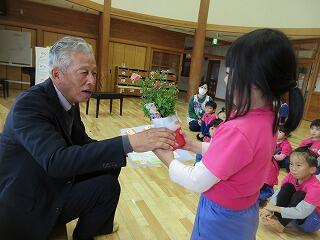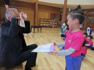 磯江先生と一緒に素読や紙芝居の読み聞かせの時も嬉しくて嬉しくてハイテンションな子ども達♪楽しい、論語の時間となりました。最後は、勤労感謝として、さくら組の友達が感謝状とお花のプレゼントをすると、「わあ~‼嬉しい」と喜んでくださいました。これからも論語教室をよろしくお願いします。