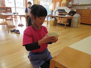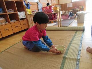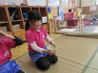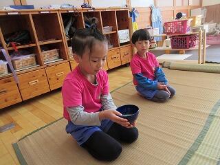 今日は、横木先生は来られなかったのですが、子どもと保育者だけでお茶会をしました。今日の目標は、”1・2・3”の持ち方でお茶碗を持つこと‼保育者が側で「1・2・3」と声掛けすると、持ち方を意識しながらすることが出来ました。給食後のお茶会で、お菓子はプチデザートとなり、とっても嬉しそうでした♡
