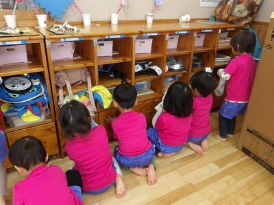 製作をした後、みんなで雑巾がけをしてみました。「ももさんの時にもやったことあるよ!」と昨年度のことを覚えている子もいましたよ。がんばるぞ~とよーいドンで一斉にスタート。掃除もみんなですれば楽しい時間になりますね。最後に自分のロッカーも綺麗にして、ピカピカになったちゅうりっぷ組のお部屋です。
