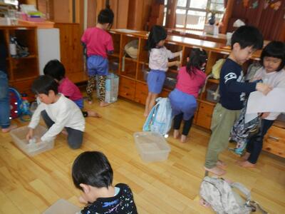 1年間過ごしたお部屋の掃除をしました。ロッカー、ケース、床等雑巾で拭いてピカピカにしてくれました。気持ちの良いお部屋になりました。進級することを楽しみにしている子ども達です。