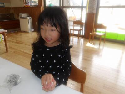 今日は、たんぽぽ組最後の日ということで、クラスでたこ焼きパーティーをしました。中身はウインナー、チーズ、チョコレート。子ども達は大喜び。具材を入れたり、焼けてきたたこ焼きをくるっとまわしたりと、すっかりたこ焼き屋さんになりきって作っていました。出来上がった熱々のたこ焼きをフーフーしながらパクリ♡「おいしいなー。」と笑顔がこぼれていました。最後の日も飛び切りの笑顔と多いな笑い声が響いていました。1年間楽しかったね‼